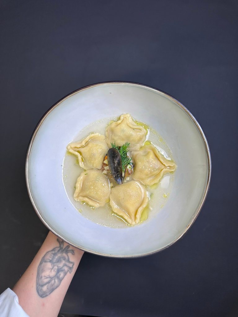 Today’s cooking challenge was Tortellini tartare de moule, bouillon de moule clarifié. Probably not the best tortellini I’ve ever made and I didn´t get much of a look-in on the bouillon preparation but I did shape and bake two pains de mie from dough we prepared yesterday and gave a hand to L. as his partner was amongst those absent ill today. I completely forgot about taking a picture of my presentation, but here’s A.’s; mine was similar but with a somewhat more classic tortellini shape (chef seemed satisfied, at least).