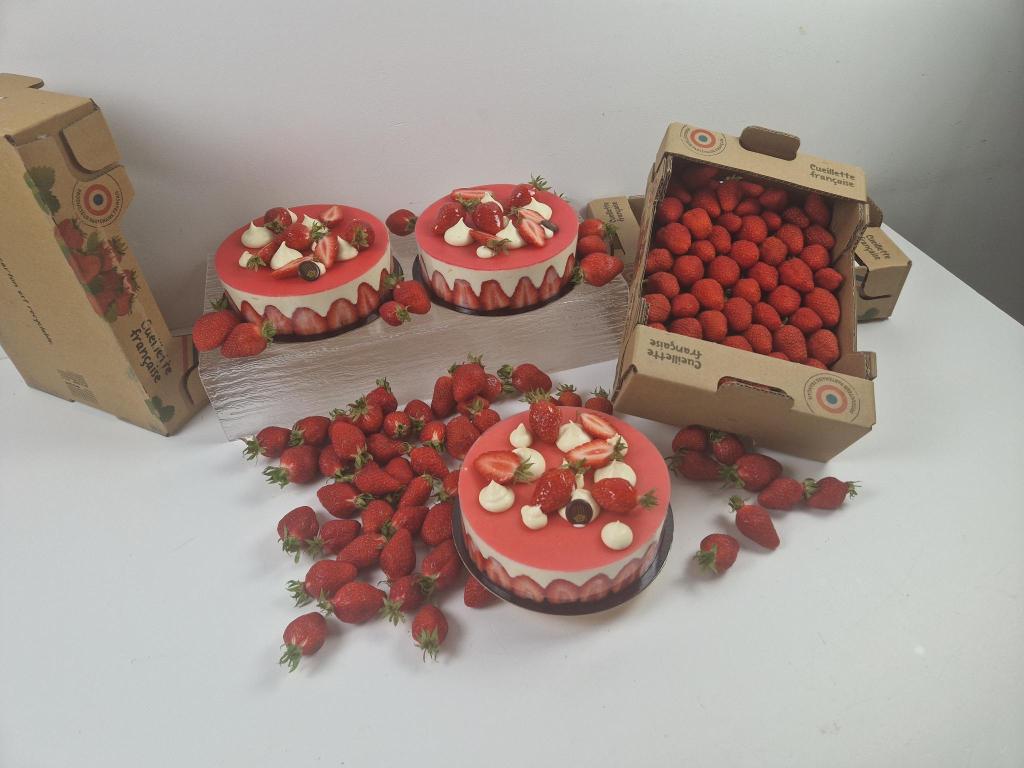 It’s actually not that hard, just time consuming. Actually, it’s not that hard when you have a partner… E. made the crème pat yesterday and emulsified it with butter today (with judicious use of a heat gun!) to make crème mousseline whilst I cut up a load of strawberries. Then you just assemble everything with a couple of disks of génoise sponge. E. also made these as I made the sponge for tomorrow’s black forest gâteau a couple of days ago (it’s being kept in the freezer).