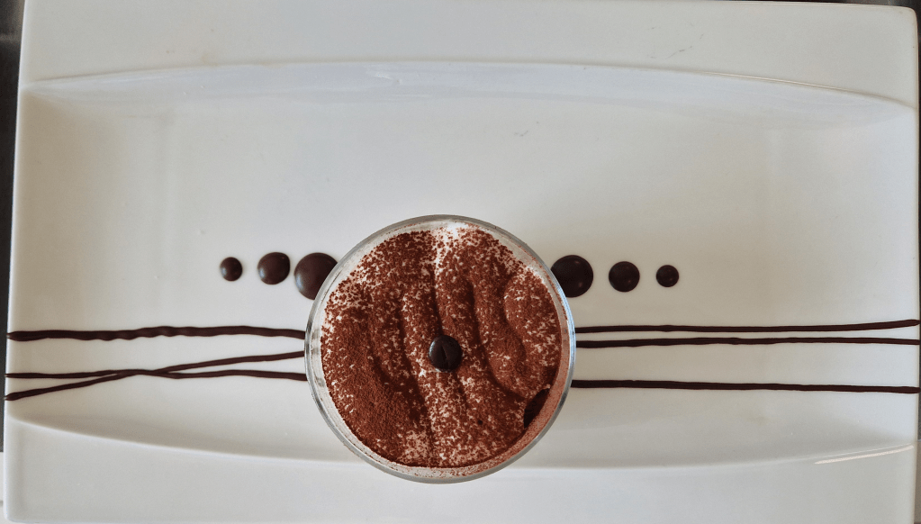 These are needed as chef wants us to pipe a chocolate decoration as we plate our tiramisu. He demonstrates what he wants and gives us 10 minutes to produce the same—the logic being that no customer will want to wait long for a tiramisu. This is a bit of a challenge for me and N. since we’ve been worried about chef-of-the-week duties and our chocolate isn´t melted yet. Still, we manage with a couple of minutes to spare and, although my blobs could have been neater, I’m happy with the lines.