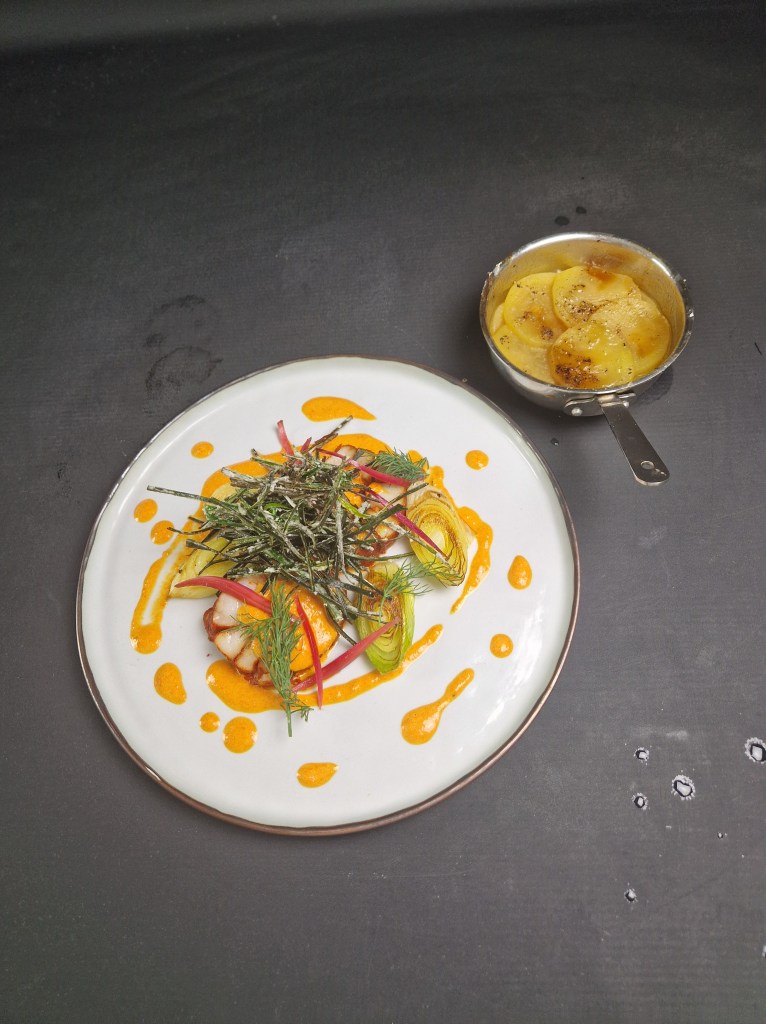 I then julienne the dark green ends of some leeks. And then 3x that quantity as we didn´t take enough. These are dried with corn starch (never flour things you are going to deep fry, folks!) and K. deep fries them. I don´t think either of us consider that these add anything to the dish apart from height—and not that much for us in any case. So, on to the red pepper sauce which, apart from me splattering K.’s folder when blending it (her back is turned and it is wiped before she comes back to the bench…), also goes well. Class votes that we copy chef’s plating rather than coming up with something ourselves and I do a respectable job apart from again showing I have no finesse when it comes to blobs and swirls: