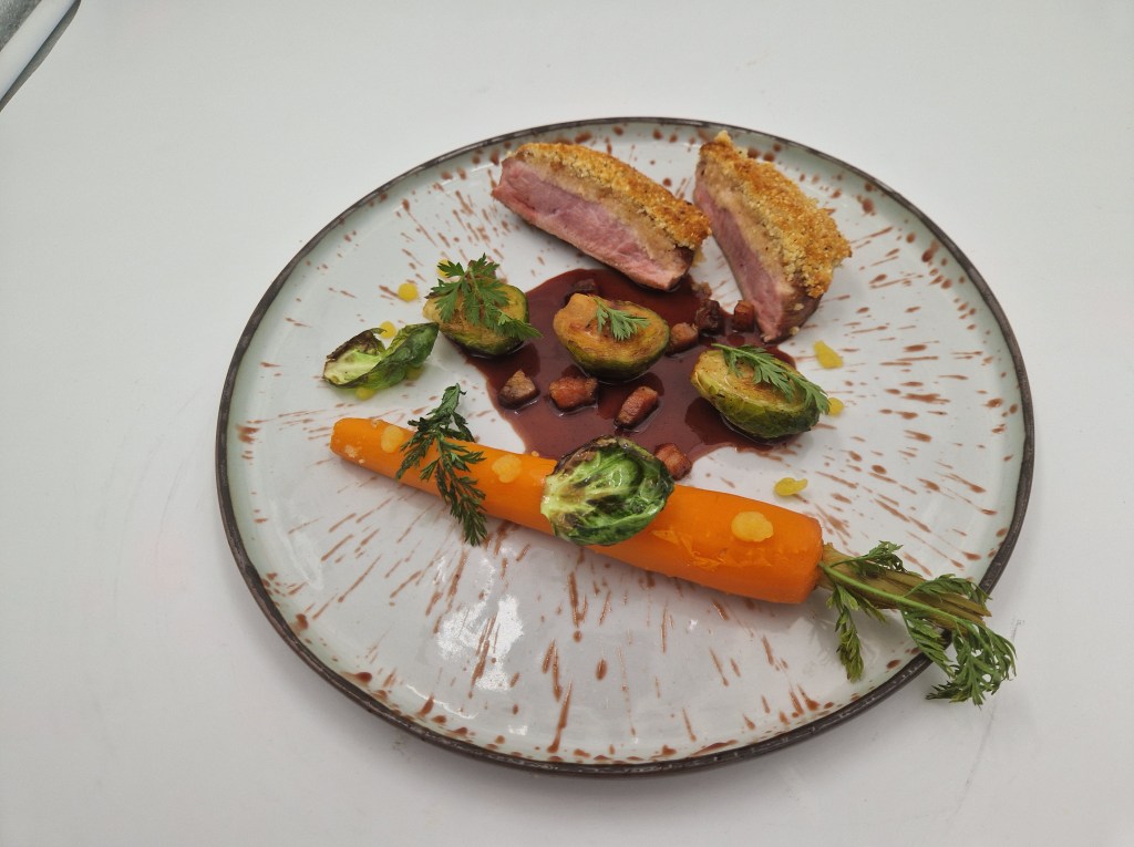 So why the “but…” above? Well, chef thinks I can be more efficient. Our duck breasts were cooked pretty early but I was waiting for them to finish resting before adding the crust. Chef tells me off for this saying the crust can be added during the resting period—and he points out the consequences of me having waited: I have to queue to use the salamander to crisp the crust rather than being first in line.