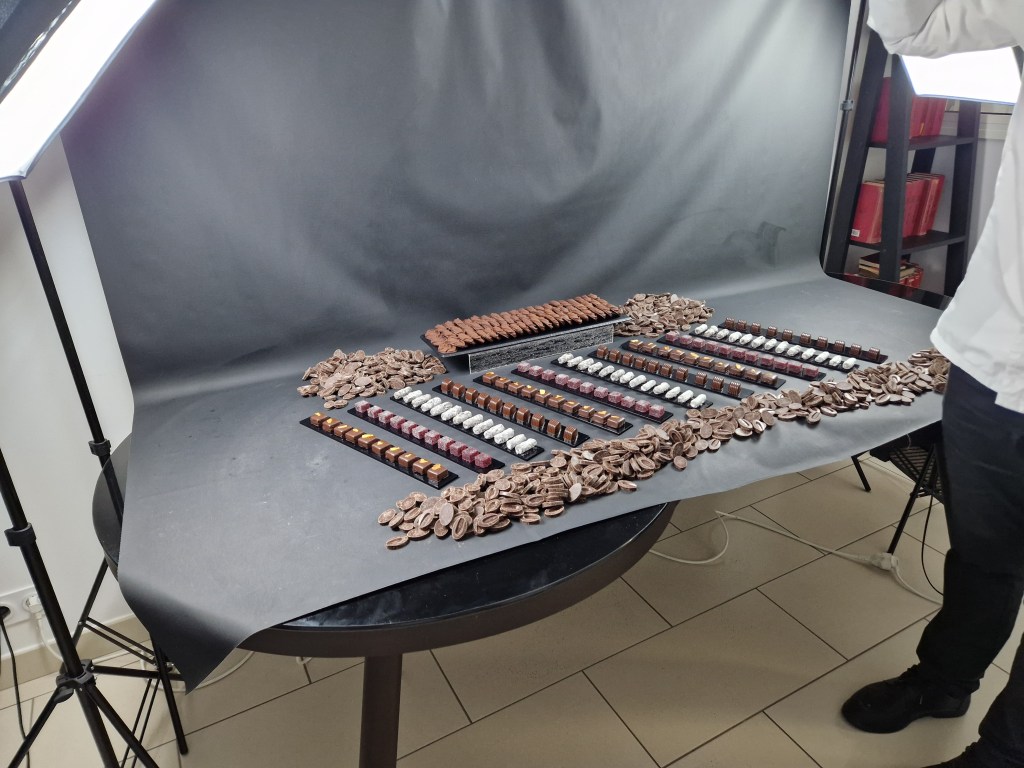 Thence to the task of the morning which is to produce coated ganache chocolates. It’s D.’s turn to temper our chocolate so I decline to step in as she tires in the tempering—she has her revenge later as a second tempering is needed! Once the chocolate is tempered we move to the messy business of filling moulds and then emptying them out to leave a thin (but not too thin!) coating for the top and sides of our chocolates. Then we have to make the ganache and it’s my turn for action rather than prep or cleaning. D., meanwhile, is tasked by chef with cutting loaves of pain de mie for some mysterious reason. The ganache then needs piping into the moulds—a task for D., of course—during which time we retemper the chocolate. D. is on some errand or other when this needs pouring over the ganache-filled shells to make the base so there’s rather a mess on our bench when I’ve finished. But it all turns out well in the end and, although I have no picture to prove it, we have 32 chocolate pieces like those between the white logs and the feuilletine-decorated squares in this picture of chef’s productions this week.
