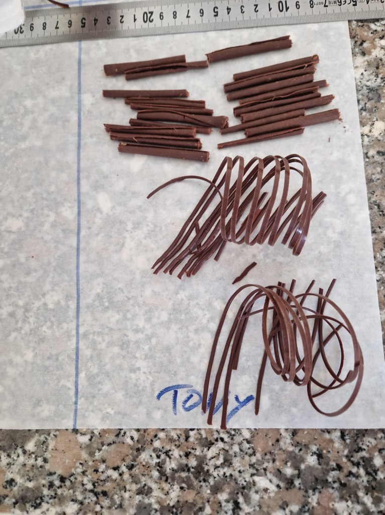 I was also pretty happy with the pastry practicals. D. tempered our chocolate flawlessly and I managed to produce 20 evenly sized cigarettes, even if they weren’t perfectly rolled—D. came up with a neat trick to test if the chocolate is ready: we’re supposed to trim the smoothed out blob of chocolate to a rectangle but she left one end untrimmed to use to test the rolling readiness before moving to the trimmed end for production rolling. And even if my spirals weren’t really much good, they were certainly better than previous attempts.