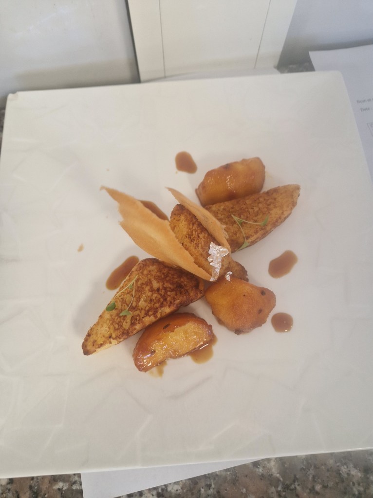 Then we had to reproduce the french toast recipe (and plate) of last week, but using the pastry cigarette mix for decorations rather than dried pear slices. Like many people, D. and I understood we had to create the rolled cigarettes. Chef’s idea, though, was that we simply use the mix and be creative. Our first set didn’t turn out too well but I spotted the cooking time was the same as for baking the toasts after browning so D. quickly knocked up a second batch of the mixture whilst I caramelised the pears. I overcooked our caramel a little but D. managed to rescue it. Partly… it was the one aspect of our dish Chef criticised. But, apart from that, we delivered a warm and acceptable plate on time!