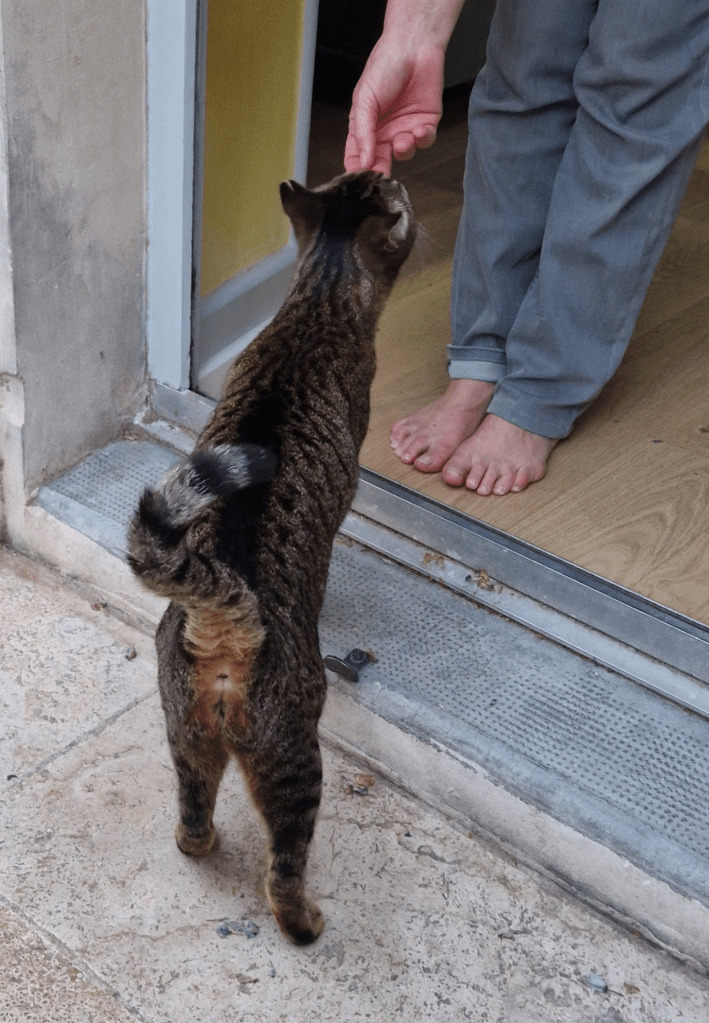 although even if Chef might have been happy with this plate, he wouldn’t have liked a picture of the two: they were mirror images. Food aside, we eat outside—yesterday and the day before there were thunderstorms in the evening—and, to J.’s delight, Cyd puts in an appearance.