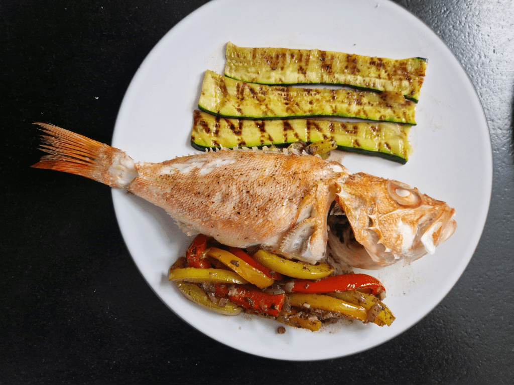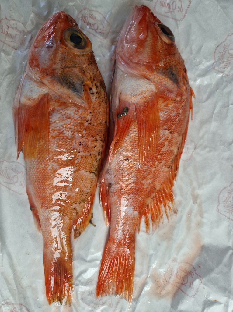Market day in Valréas and, as usual, we head to the fishmongers first. There’s a difficult choice. They have Tassergal, a fish we’ve never heard of which is apparently similar to sea bass and bream in flavour. But they also have some large Rascasse, just right for baking in the oven. We’re told to take the rascasse if we only go for one as rascasse that large are rarely on offer. But we can’t risk not seeing the tassergal again so we go for both.