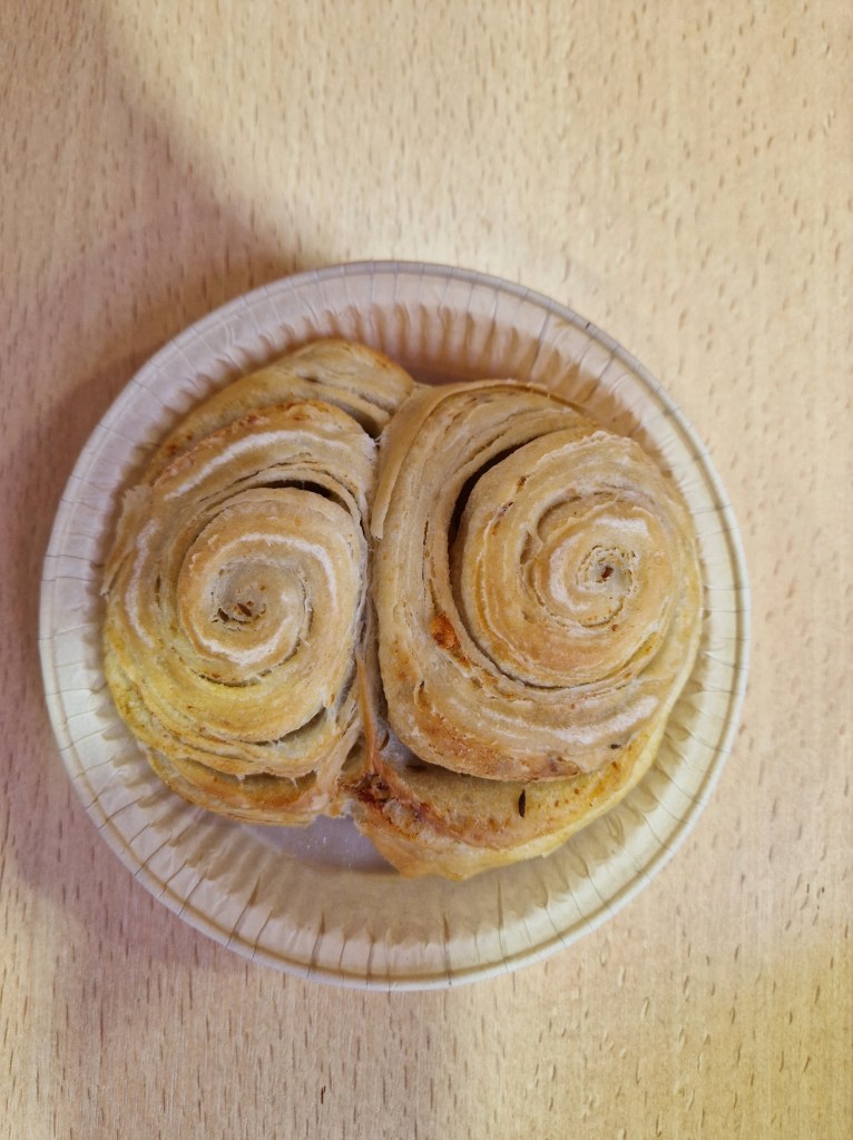 The simple feuilleté gives another practice: turning it into a log which we then cut in slices and bake. Again, doing this for the pain au raisins pastry is a little harder and I’m glad I don’t have a picture of my pastry rectangle (covered with crème pat and raisins) before it was rolled. Let’s just say it wasn’t an ideal rectangle (but I think only chef managed that). Fortunately, this isn’t too important for the pains au raisins, but perfection is important for the croissants tomorrow!