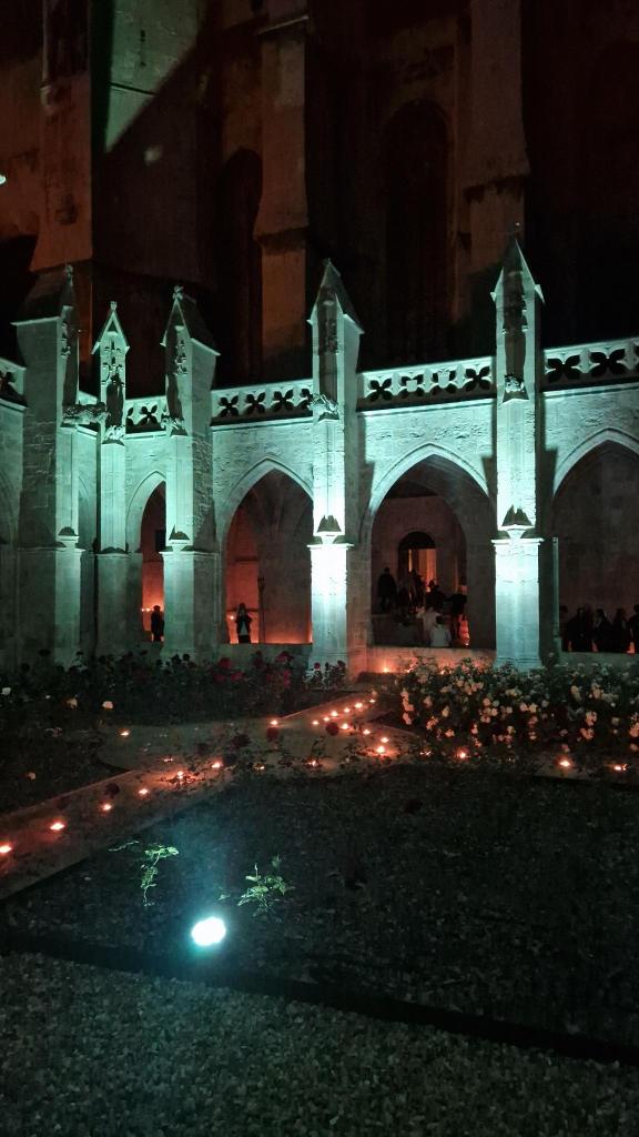 We return to the main square to visit the archbishop’s palace and the cathedral and start by climbing the stairs (142 or 162, certainly not the 62 as announced on the panel) to the top of the main Gilles-Aycelin tower for an impressive view over the city. After a tour round the new palace and art gallery (yet more stairs!) we visit the cloisters and enter the cathedral (only the choir part was completed, but it’s high and impressive nevertheless) to see a scout tossing tea lights to another who is placing them round the walls. It turns out that there is going to be a candlelit concert this evening followed by a procession round the cloisters. We catch the end of the concert after our dinner at Chez Lulu, have a front-row view as a group of nuns sing hymns in the candlelight and then a last look around inside as the organist is playing a few encores.