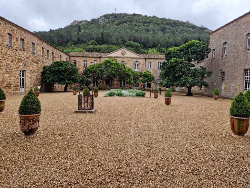 The rain held off on Saturday but we wake to a downpour on Sunday morning. Over breakfast we decide we can’t miss the chance to visit the *** Abbaye de Fontfroide, especially as I manage to reserve a table at the well recommended restaurant there. We drive through showers but the sky is clear as we arrive. Nevertheless, visitors are being recommended to see the gardens first as the heavens are expected to open. We follow the recommendation but, if anything, the sky is clearing and there is bright sunshine as we start to look around the abbey proper. It was bought (at auction) in 1908 by Gustave Fayet after the monks left and various of his paintings of the abbey and grounds are dotted around in an exhibition to mark the centenary of his death.