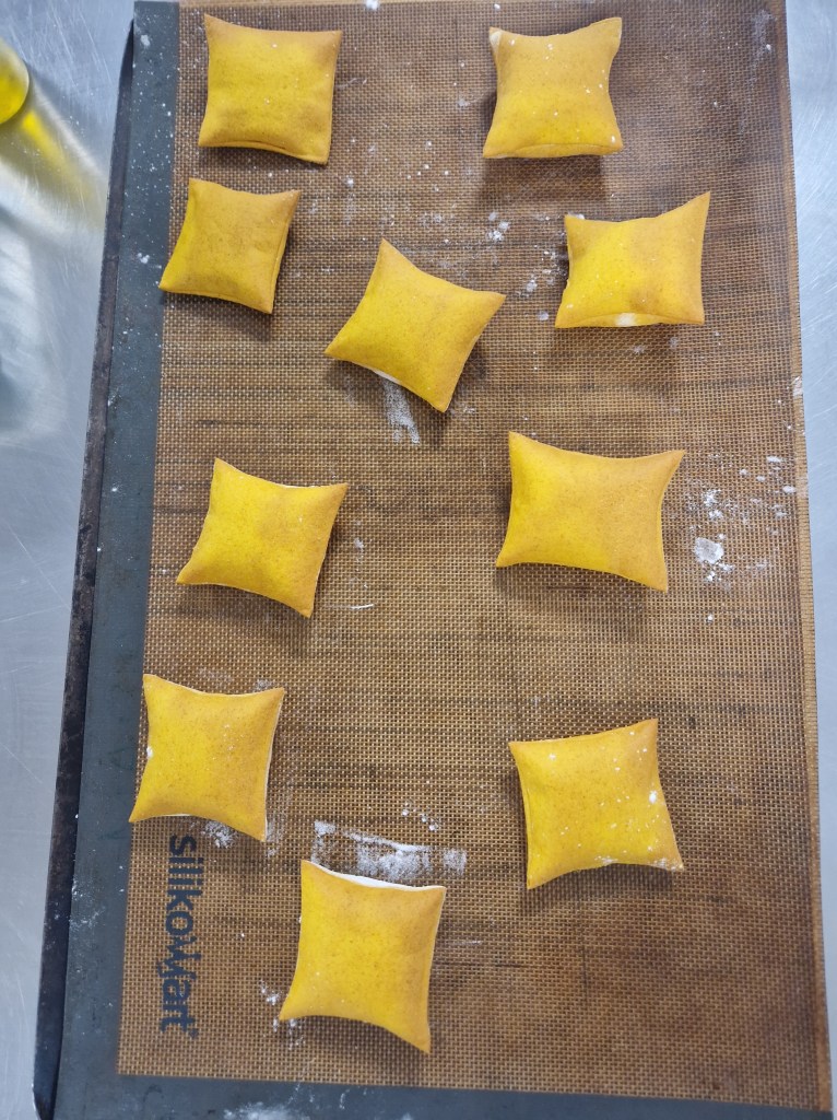 The afternoon’s recipe was for a prawn tartare to be served in a crispy pillow with beetroot tartare and a prawn bisque. The crispy pillow was made by treating a pasta dough like puff pastry—giving it three double turns to add layers. Then, once I’d rolled it out in the machine, it had to be cut into 7cm squares and transferred by knife onto the baking sheet; any handling by fingers being guaranteed to prevent the dough from puffing up in the oven. Not a problem for mine: 10 dough squares prepared and 10 pillows produced even though we only needed two!