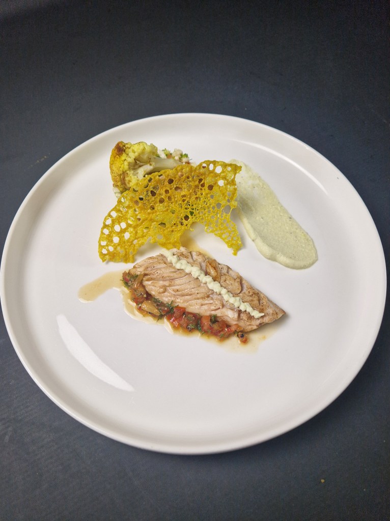 After lunch I also strike lucky as I’m partnered with M.—the returnee from last year, if you remember—although as he’s a rather tall guy we have to move our boards around a couple of times so we can both work at the bench on our different tasks. The first of which is to gut and fillet a mackerel. Chef gives M. a spare one which I take as being because M. is a returnee, not because I’m making a pig’s ear of my filleting. I’m not, although I certainly don’t do such a good job as I did with the sea bass in the first week. M. then prepares and roasts some cauliflower and shreds cabbage and broccoli for a “tabouleh” whilst I prepare a sauce vierge and a tuile mixture.