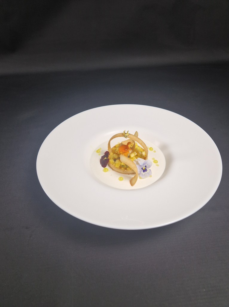 We then learn yet another method of making tuiles: pour the mixture into a hot frying pan from a squeezy bottle, watch the water evaporate and then shape the setting tuile. Unfortunately, M. and I have a frying pan with a raised middle so our mixture runs to the edges. Switching to a new one gives a better result but we don’t really have a great choice of tuiles for plating. My plating is considered as simple but elegant although I should have placed the mackerel skin side up. That way the customer sees that the skin is on and can choose to remove it. I can confirm, though, that the mackerel was delicious eaten with the skin. But that is my taste. And chef remarks yet again that restaurants need to take into account the differing tastes of their customers.