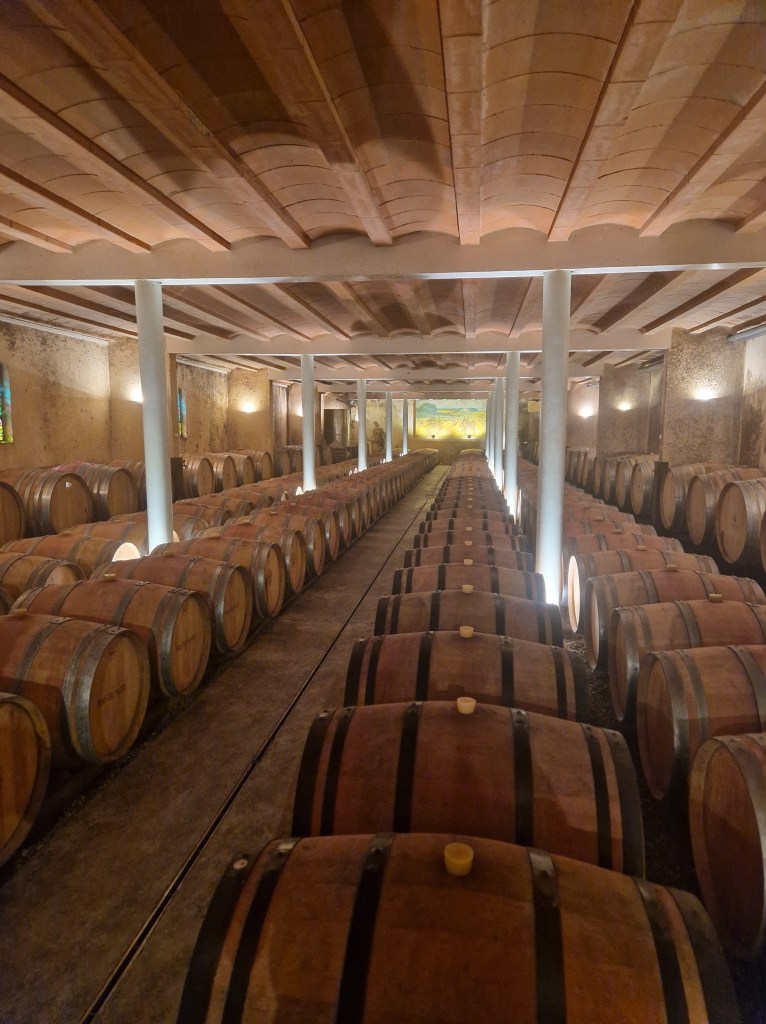 We have a relatively early start on Sunday for our sommelier to drive us to Mas de Novi, an estate that turns out to be next to the Abbey de Valmagne we visited last week. Indeed, there is a link: the “Novi” in the name reflects the fact that the buildings once housed novitiates. We have an interesting tour, enhanced by apposite questions from our sommelier which bring out the subtleties of the AOP rules and wine making process, including a discussion about the difference in size between Bordeaux and Burgundy barrels and the impact this has on the maturation of the wine (none as it is just 3l: 625l vs 628l, apparently). As well as the barrels, they also mature some wine in amphorae and some in clay eggs, although our guide (there for just a few months) couldn’t explain the reasons for this.