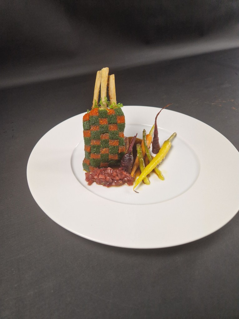 But R.’s sins of yesterday are forgiven as his Michelin star skills come to the fore in today’s exercise which is to coat a lamb rack in an orange and green chequerboard coating. We both work on cutting strips from blast-chilled squares of the different colours, with R. giving me a tip on how to cut them in identical precise widths. When it comes to turning the strips into the chequerboard pattern, though, I sensibly leave things to him whilst I finish cooking the vegetables. And, of course, I’ve taken the chine bone off a 3-rib lamb rack, french-trimmed it and cooked it along the way. Chef is complimentary about my plate but he knows full well who I’m working with! I can’t help feeling pleased, though, when R. comments at the end that I’m a good partner.