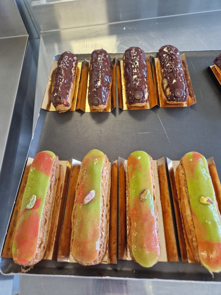 Then the second half of the choux workshop where we bake our eclairs and choux buns and turn them into patisserie wonders. It’s not so much a choux workshop as a piping workshop! Three of our preparations from yesterday—chocolate and pistachio creams and the cherry confit are coaxed from cold into a pipeable consistency and piped into the base of our eclairs. The chocolate ones are dipped in a chocolate glaze; we prepare a green and red marzipan topping for the others.