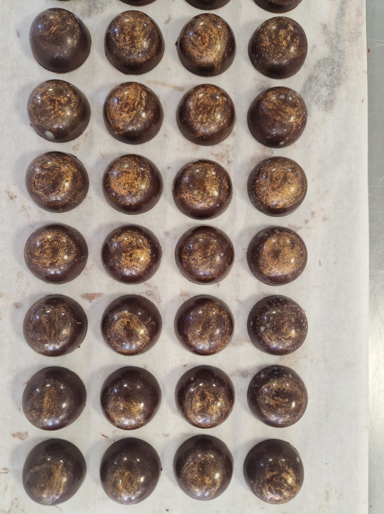 Anyway, we learnt last month to prepare chocolates in a mould but today’s challenge takes that to a new level. And, just as with the pain aux raisins being an “easy” exercise before the croissants, Chef warns us that mistakes today can be hidden, but not those tomorrow. The first step is to line the moulds with a thin layer of chocolate (dark today, white tomorrow), so, as it’s E.’s turn, she starts tempering 500g of dark chocolate. The twist this month is that the tops of the chocolates will be decorated. I do this by the high-tech method of flicking cocoa butter specks into the mould from a toothbrush and then using a cotton bud to swirl gold powder around in each indent. The unforgivable-tomorrow error is to leave any spatters of cocoa butter on the mould; these will be covered up today but they will be coloured tomorrow and so leave streaks in the white chocolate coating.