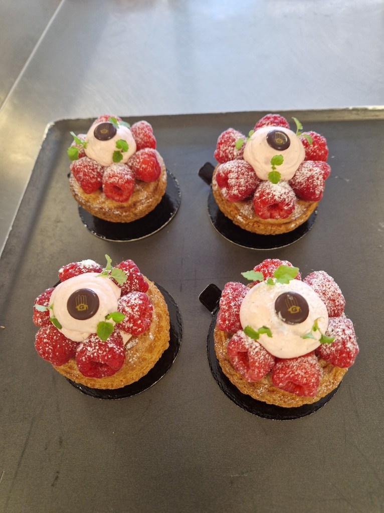 We then whip (carefully!) the ganache montée, pipe this into the bottom of upside-down choux buns and decorate these with raspberries and (cheffy touch…) cress.
