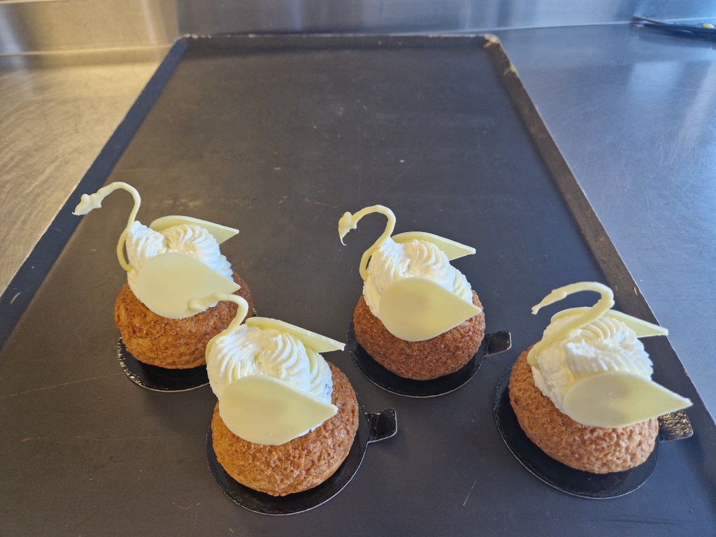 The wings are simple shapes cut from tempered white chocolate. The necks and heads are made by piping an ‘S’ shape with a parchment cornet and then adding a blob and a thread at one end. The wings, of course, could be made by cutting the top of the choux bun in half…