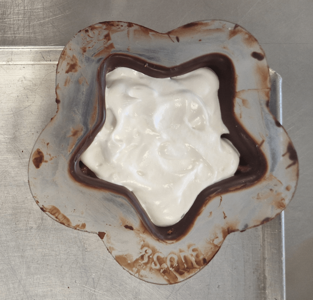 The filling is marshmallow, but, unlike the version we made on Tuesday, one made with whisked egg whites—like an Italian meringue—so it can be piped into our chocolate shells on top of some piped caramel (a final use of the caramel à pocher we made on Monday) and toasted almonds. And afterwards into multiple marshmallow whirls which, like the marshmallows yesterday, we coat with a mix of icing sugar and cornstarch.