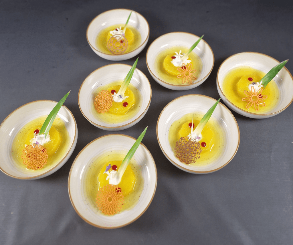 Then there are a couple of things I’ve actually done at home myself: fizzy orange segments and “cooking” pineapple rounds in syrup using a vacuum sealer. L. plates the pineapple dessert (see later for the orange segments) but neglects to tell us the crispy tuiles are left over from his test yesterday. Mine tastes of turmeric which does not complement the pineapple at all!