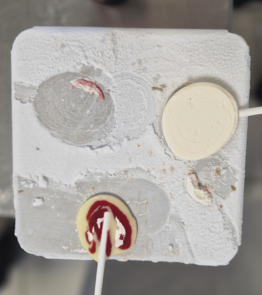 On to things I definitely won’t be able to do at home, but much of which I’ve seen demonstrated at CERN, especially at Open Days: preparations with liquid nitrogen. We have the usual sorbet and ice cream (delicious!) and also a cheesy popcorn made by using a siphon to put a parmesan cream mix into liquid nitrogen to expand as it freezes and breaking this into pieces. We then make cheese lollipops on a “nitrogen teppan”; delicious but some people are becoming cheesed out and use the crème anglaise and raspberry mixes for a sweeter version.