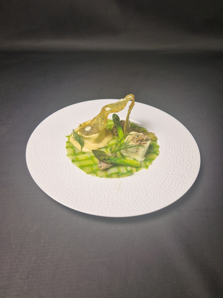 For cooking, chef has said there will be less actual cooking this month, the focus will rather be on techniques. It’s cold starter week and our task is to make cubes of asparagus gel with a crab meat stuffing and serve these on an asparagus stalk lattice with a crispy tuile and a Noilly Prat based sabayon. The first step is to use a vegetable peeler to cut thin strips from the asparagus stalks which are then blanched. The trimmings are boiled with milk then blended with gelatin and, after a short spell in the blast chiller, the strained liquid is put into molds with the crab meat and frozen again. Today’s tuile preparation (there’s a different one tomorrow) has us spreading the mix on silpat, baking it for a few minutes, making a fancy shape and finally baking it a bit more to set. H., my partner this week and I are next to my partner of last week and I see him putting the mix on parchment paper out of the corner of my eye. This gives me an idea, so I do likewise and drape the parchment strip over some rings on the silpat hoping to create a shape from the beginning. I also, though, make another on silpat just in case, using spoons underneath to create a wavy shape.