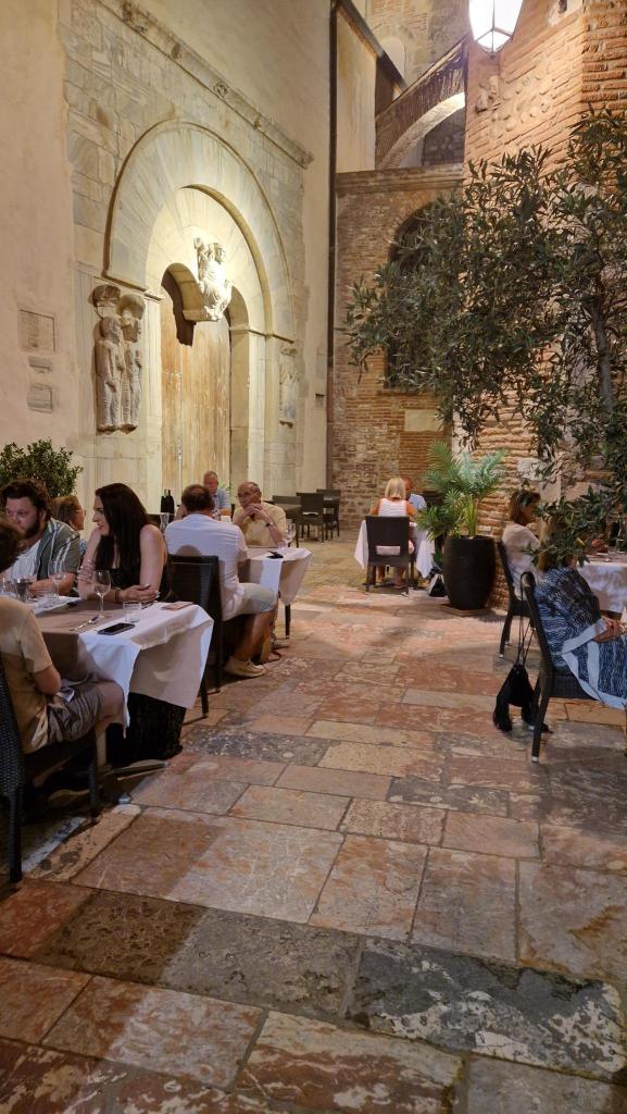 Our hotel in Perpignan was well sited, right by Le Castillet, but that was pretty much all it had going for it—apart, perhaps, from a very quiet air conditioning unit which we could leave on all night so the room was refreshing given the high temperatures. After dumping our bags we head to the main square, La Loge, after a detour via Monoprix for J. to buy flannels and socks. Then over the canal to Les Halles where we have a beer whilst I write up Friday’s entry. The live music is getting a little irritating and the phone signal is poor so we look for other bars by the canal to find they are all closing at 7pm on a Friday! We head to a café/bar by Le Castillet but even that is winding up, something we find a little surprising. Anyway, that’s fine as we wander to Le 17 where we have a reservation at 8. Expecting a restaurant with a little terrace on the street, we find tables in a stunning setting between the cathedral and an old chapel.