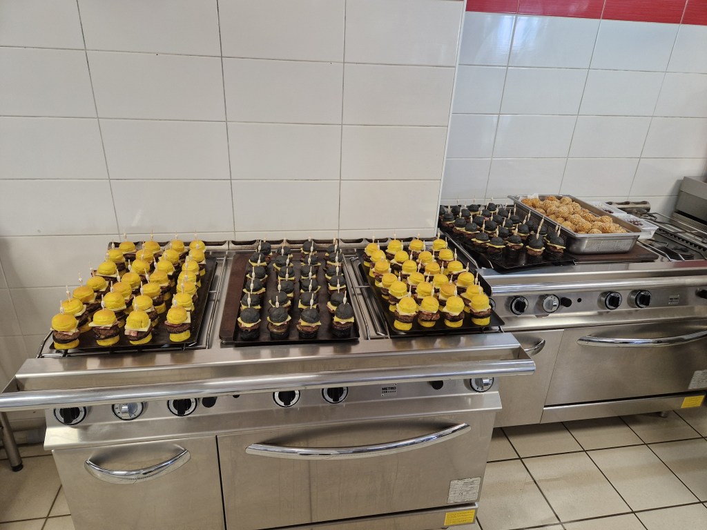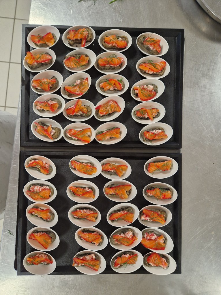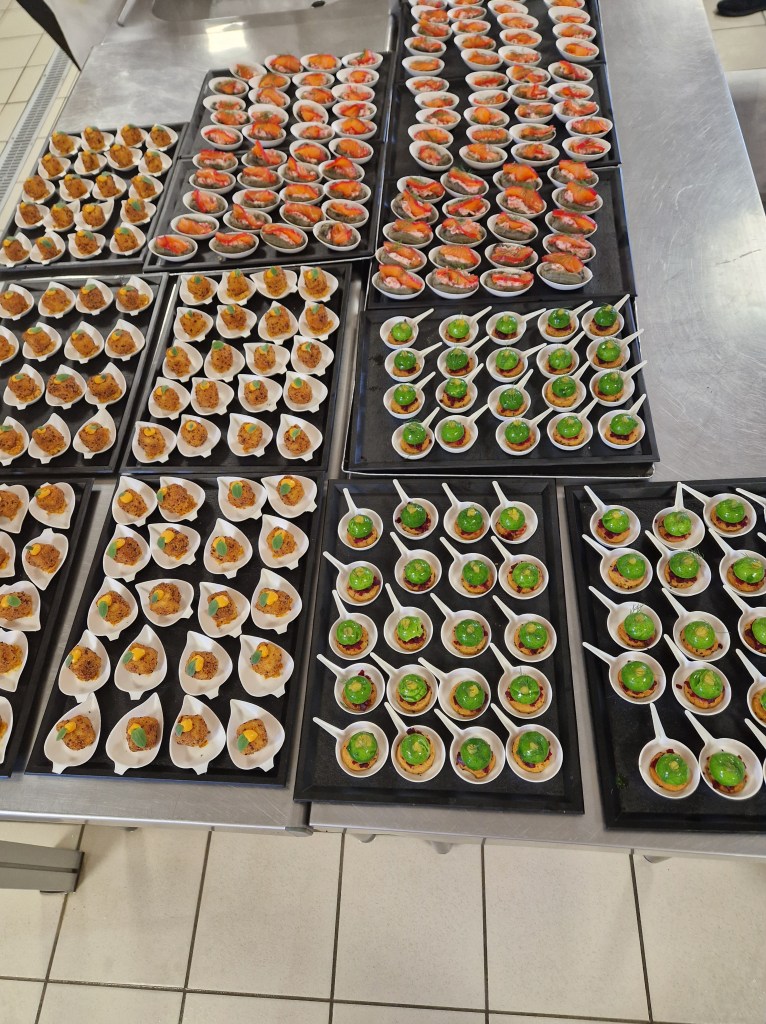There’s a graduation ceremony just after we arrive then the assembled guests start to try our various offerings. I’m pleased to see our salmon boats are snapped up and particularly appreciate two offerings from L. (one of the chef’s on the Valréas trip), a langoustine based mix in a delicate butterfly tuile and a foie gras & pain d’épice ensemble. The hot offerings appear only after a speech, but the burgers are good as are A.’s arancini.