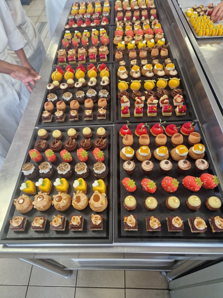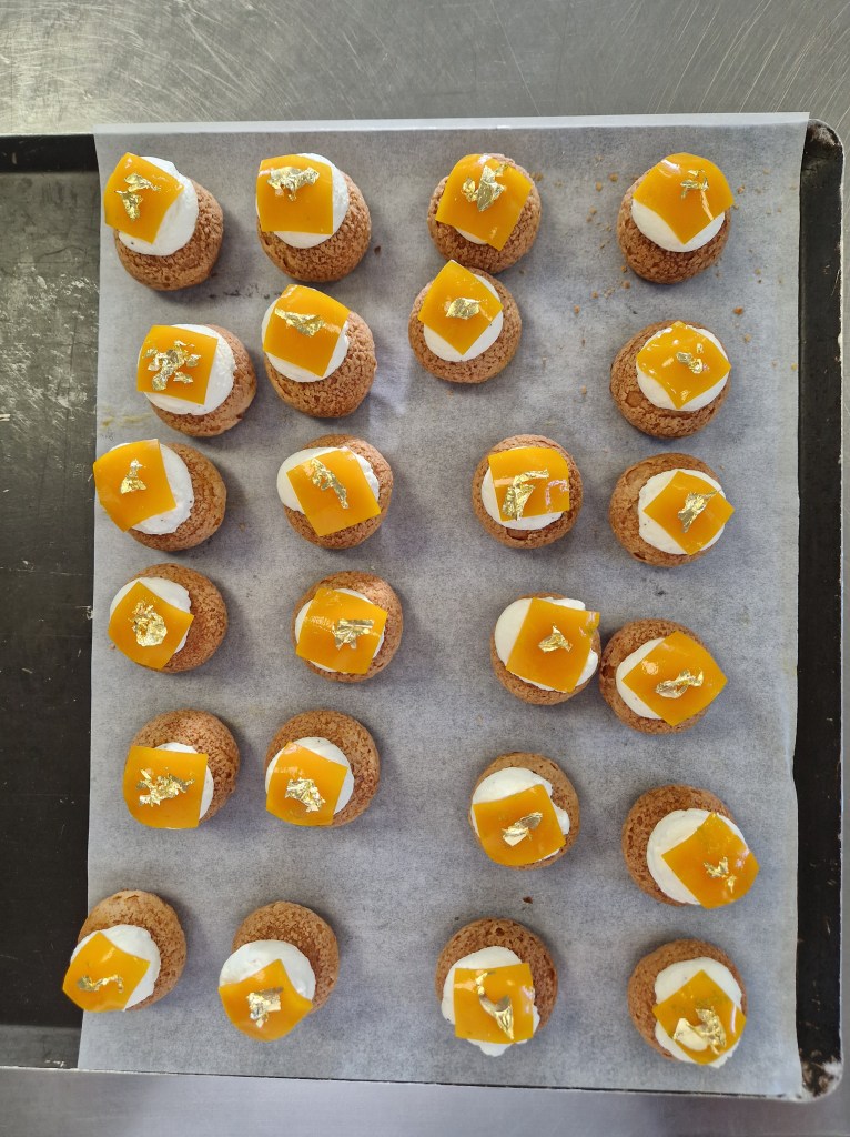 An early start today so we can finish early to give us time to change before the cocktail. Chef has put our choux buns on to bake so “all” S. & I have to do is to fill these with a mango, passion fruit and lime salad, pipe on whipped cream/mascarpone top with a square of mango and passion fruit gel and add gold leaf. The first step is simple: weigh the cream and mascarpone and put in the fridge to chill before whipping. The next step is equally obvious: prepare the fruit filling. S. opts to do this as we also have to finish our rice pudding mousse delicacies and this requires the 16x16cm square of frozen mousse to be cut up and placed on the shortcrust squares. S. considers I’m better at the cutting up side of things so starts on the peeling and chopping of the mango as I put the shortcrust squares in to bake.