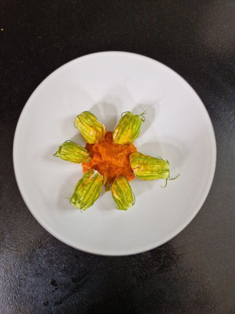 Also in the market were courgette flowers. (And Gariguette strawberries which, assiduous readers will doubtless remember, are the best and tastiest. These did not disappoint!) Having bought both I went back to the fishmongers to see if I could find prawns for a mousse filling for the flowers. As they didn’t have any suitable I had to settle for a chicken mousse filling for lunch as there were none in the supermarket either. (But there will be tomorrow and, as I didn’t mess up filling the courgette flowers, I have plans…).