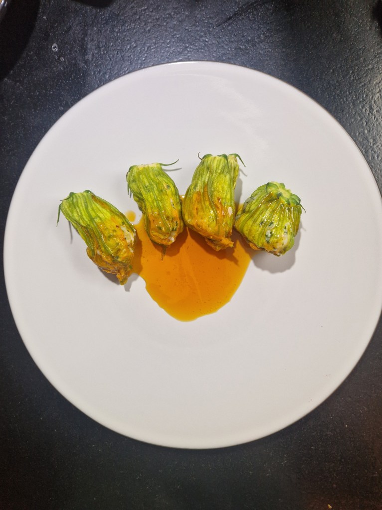 Preceded by the last of the courgette flowers, stuffed with a prawn mousse this time with a prawn-infused oil sauce. Inspired by a skills test from an earlier Professional Masterchef series…