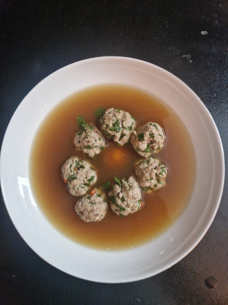Sadly, the chicken wings I bought were missing the wing tip so after boning a couple out (which already took me the allotted 20 minutes!), I had two tubes which weren’t going to hold any stuffing. I guess I could have fastened both ends up with a cocktail stick but they wouldn’t either have a convenient handle with which to pick them up. So I decided to serve pork meatballs in a chicken broth.