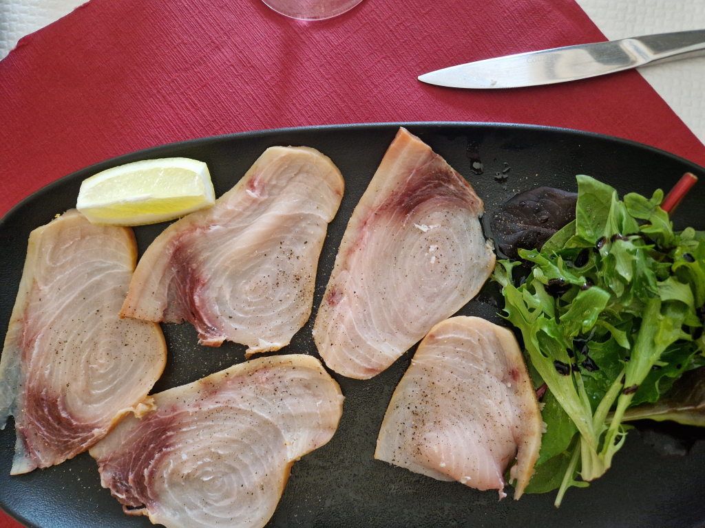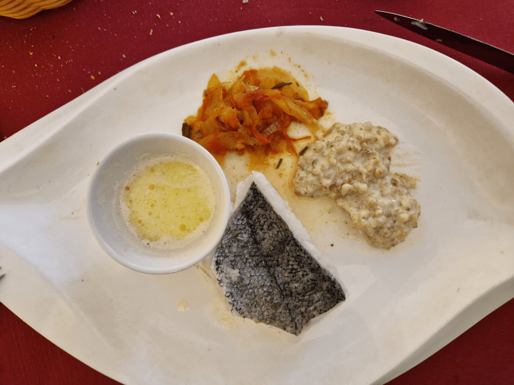 After wandering round for a bit, I find a calm spot to sit and read until it’s time for dinner. An unfashionably early dinner and I’m a bit disappointed to be turned away from the place I had chosen, Le Local, at 7pm—as I’m not even allowed to wait until the kitchen starts taking orders at 7:15. So I head to the Bistro de la Mer instead where, after a bunch of guests for the hotel troop past my table, I can order—home smoked swordfish followed by hake.