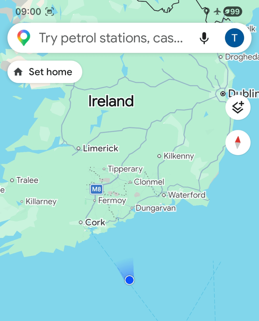 Then it’s off to the ferry port for waiting, check-in, waiting and loading. There’s a rather hairy moment at that last stage: we’re the last cars on our deck and have to park on the ramp; the car in front of me keeps slipping back and I have to reverse sharpish. Fortunately there are some chocks to hand—and the ramp is lifted up to the horizontal so the deck below can be filled so I’m sure the trusty 3008 will be safe. My cabin is right at the front of the boat with the bed width-ways so the rocking motion takes some getting used to but I manage to sleep in bursts.