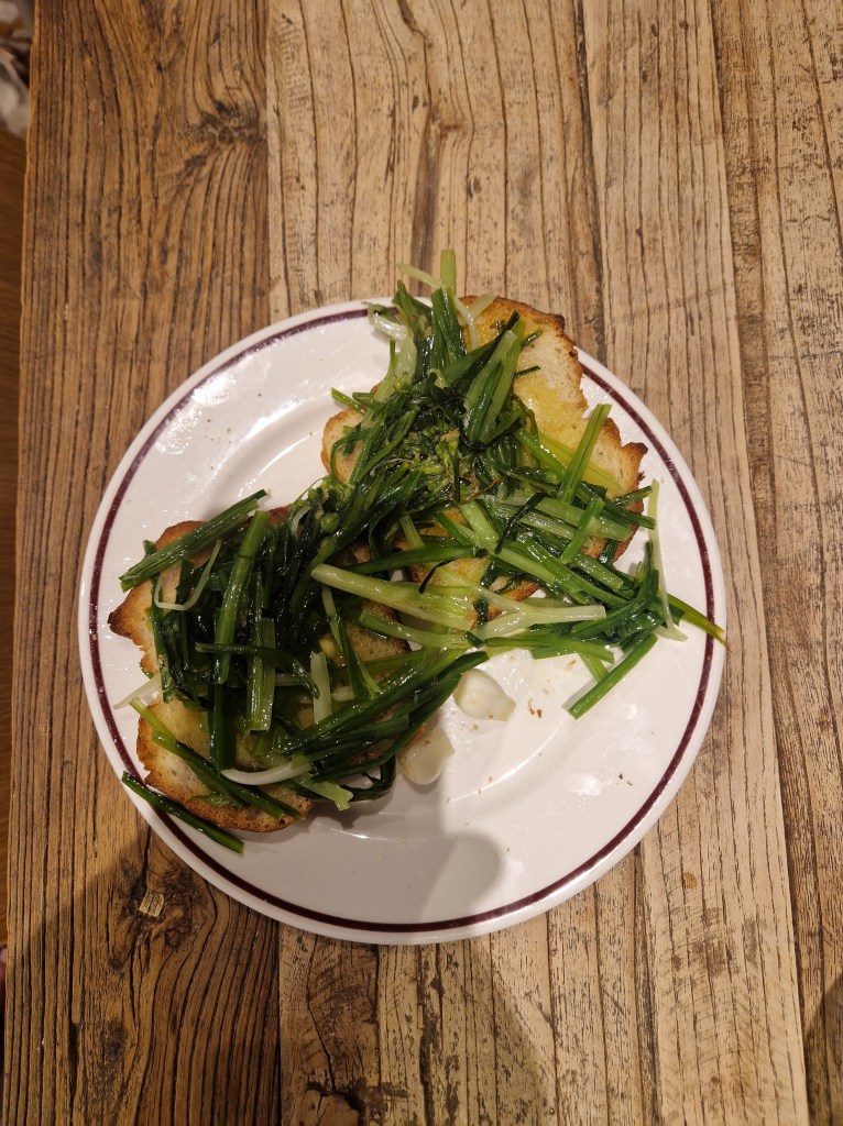 More interesting is the foraging on the way back. I learnt during the afternoon demo session that there are two sorts of wild garlic. As well as the flat leaved, shade loving allium ursinum (ail d’ours in French…), there’s also a triangular leaved, sun loving allium triquetrum which is growing in abundance along the side of the road. I pick some intending to have it sautéed on toast for supper.