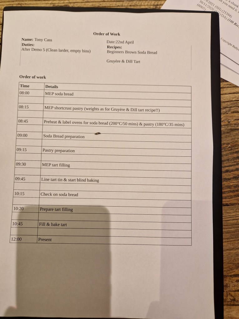 After lunch (communal; eating the food we’ve prepared) we have the demo session for the dishes to be cooked tomorrow. We were running behind schedule but I managed to fit in a 30 minute bike ride before knuckling down to my homework. Which ended up as being a joint study session in the kitchen with some discussions which show that we’ve not yet really learnt what we’re having to do. I’m worried, for example, that I’ve missed off salad preparation from my Order of Work as JB, who is making a different tart, is making one. But I think that simple salad preparation is one of the duties so I’m probably OK.