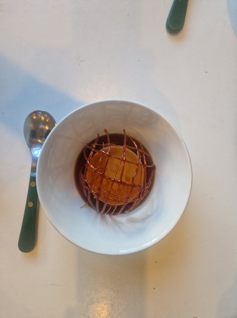 Despite my misgivings yesterday I made the wet caramel as a base for the crème caramels fairly quickly. And indeed the custard filling. They seemed to want to take an age in the oven but that wasn’t much of a problem apart from the need to keep hassling my partner when I needed to look in the oven. I probably took the dry caramel a little too brown but once it had cooled down a little it wasn’t too hard to make some interesting shapes—drizzling the hot caramel into cold water produced a nice sugar crown, for example, and I managed to produce a “cage” using a ladle as a mould. The teacher this week also showed me how to make shapes using her fingers. It seems she has asbestos tipped fingers, though, as I found the caramel far too hot!